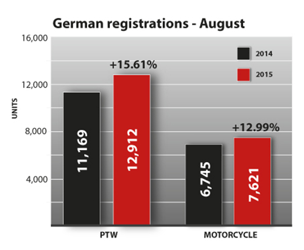 The latest data released by the German motorcycle industry trade association (IVM) shows new motorcycle registrations up by +12.99 percent (7,621 units) for August 2015 and +6.77 percent (88,047 units) for the year-to-date.