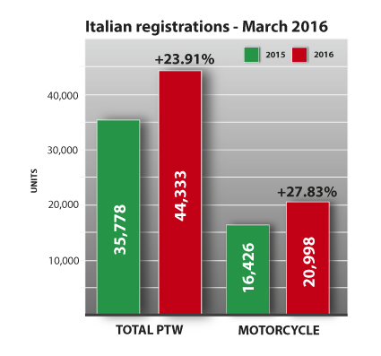 In total PTW terms March was reported as being +17.12 percent (19,468 units), with the Italian market +23.91 percent for the first three months of 2016 at 44,333 units.