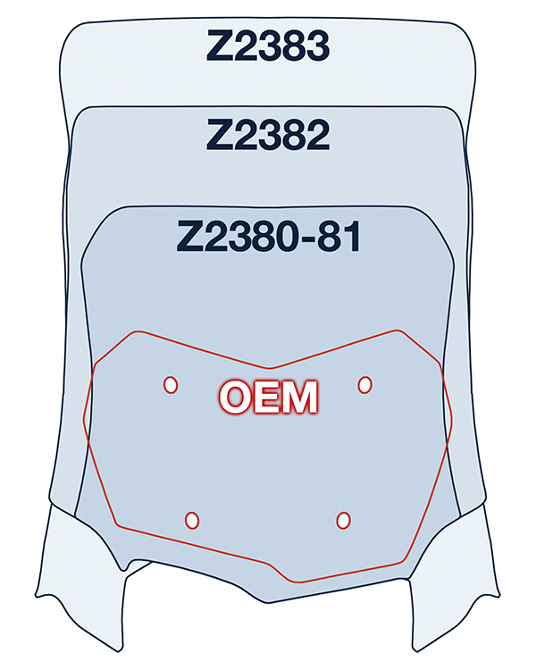 Available as a 'Sport' windscreen in light or dark tint; 'Sport-Tour' in light tint; 'Touring' in clear.